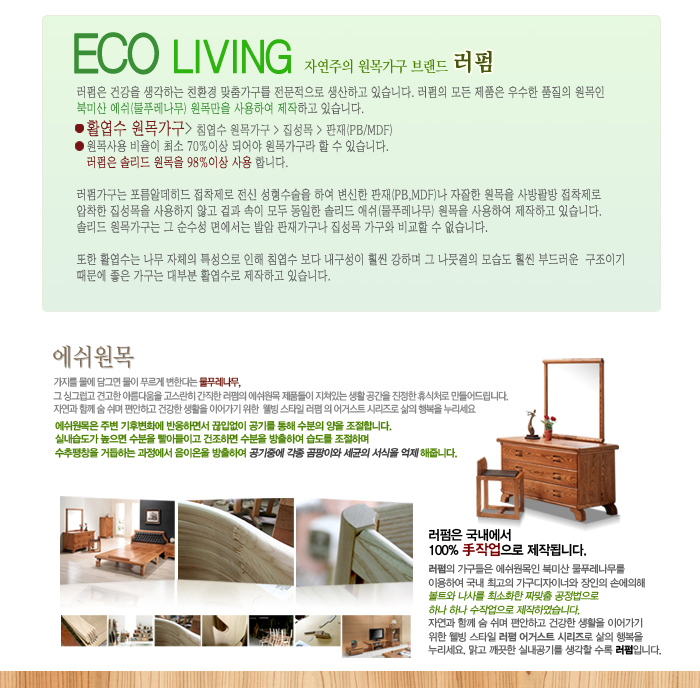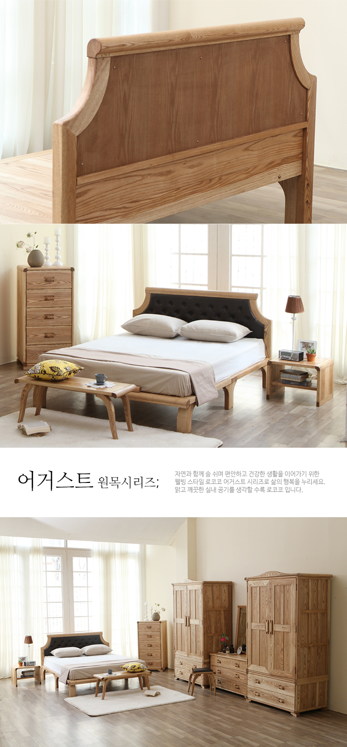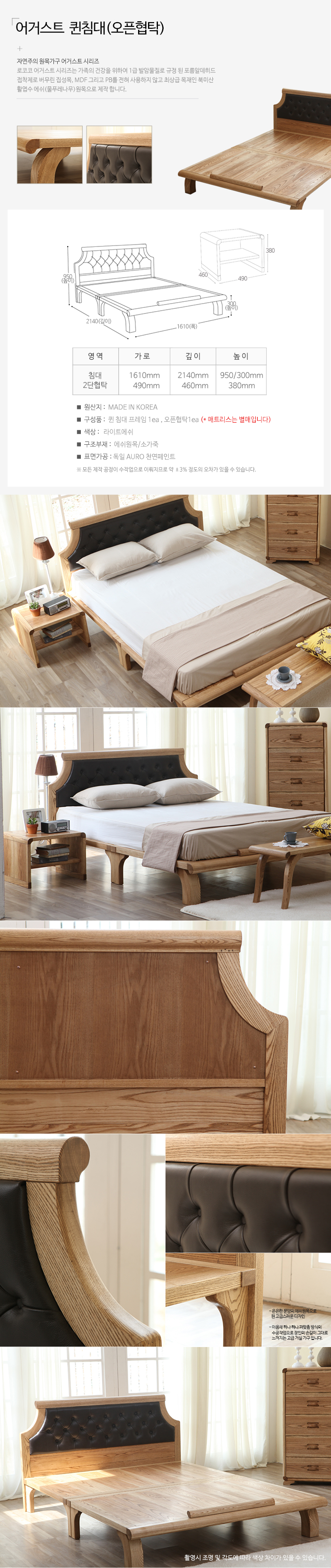 품명 어거스트_에쉬원목 퀸 침대프레임+오픈협탁 KC 인증 필 유무 H215-11-03561 제조자 ㈜리안 제조국 국내 구성품 퀸침대프레임,협탁 크기 퀸침대 1610(W) x 2140(D) x 950/300(H) /협탁 490(W) x 460(D) x 380(H) ±3% 오차범위 있음 색상 라이트에쉬 주요 소재 솔리드 에쉬원목,독일AURO천연페인트,소가죽 자세한 내용은 상세참조 배송,설치비용 설치비용 없음(단.제주 및 도서/산간 지역제외 또는 기본배송비 이외 비용추가) 주문일로부터 5일~10일 이내(공휴일제외) 배송 ,자세한 내용은 상세참조 품질보증기준 소비자기본법 제 16조 제2항의 규정(공정거래위원회 고시 제2008-3호)에 따라 A/S 실시합니다. 자세한내용은 상세참조 A/S 책임자와 전화번호 ㈜리안 고객센터 : 1566-1366 -
