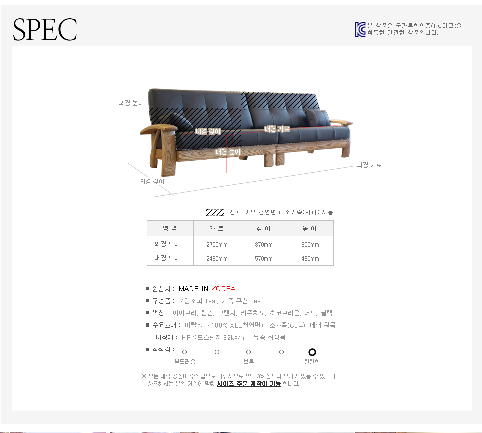 품명 이탈리아_오크라인 카우천연면피가죽 4인 KC 인증 필 유무 H215-11-03561 / H231-12-22106 / SPKGD13-00003999 / 제조자 ㈜리안 제조국 국내 구성품 4인 크기 4인 2700(W) x 870(D) x 900(H) ±3% 오차가 있을 수 있습니다. 색상 머드,린넨,초코브라운,아이보리,오렌지,블랙,카푸치노 주요 소재 천연가죽(소) / 에쉬원목 / 뉴송 집성목 / HR골드스펀지 자세한 내용은 상세참조 배송,설치비용 설치비용 없음(단.제주 및 도서/산간 지역제외 또는 기본배송비 이외 비용추가) 주문일로부터 5일~10일 이내(공휴일제외) 배송, 자세한 내용은 상세참조 품질보증기준 소비자기본법 제 16조 제2항의 규정(공정거래위원회 고시 제2008-3호)에 따라 A/S 실시합니다. 자세한내용은 상세참조 A/S 책임자와 전화번호 ㈜리안 고객센터 : 1566-1366 -